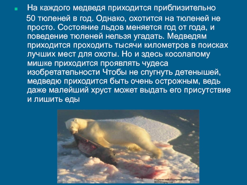 год. Однако, охотится на тюленей не просто. Состояние льдов меняется год от года, и поведение тюленей нельзя угадать. Медведям приходится проходить тысячи километров в поисках лучших мест для охоты. Но и здесь косолапому мишке приходится проявлять чудеса изобретательности Чтобы не спугнуть детенышей, медведю приходится быть очень острожным, ведь даже малейший хруст может выдать его присутствие и лишить еды