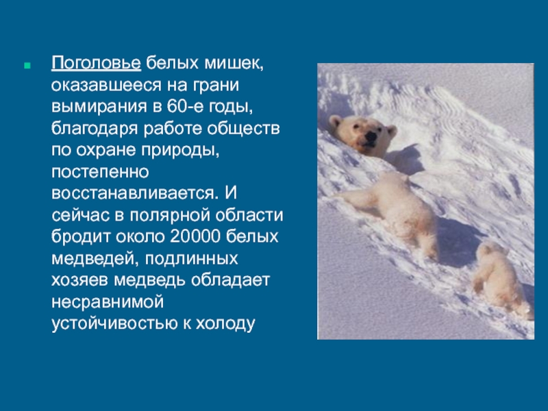 работе обществ по охране природы, постепенно восстанавливается. И сейчас в полярной области бродит около 20000 белых медведей, подлинных хозяев медведь обладает несравнимой устойчивостью к холоду