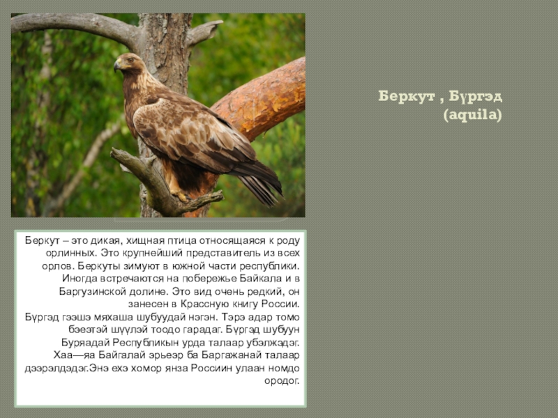 Беркут , Бүргэд (aquila)Беркут – это дикая, хищная птица относящаяся к роду орлинных. Это крупнейший представитель из всех орлов. Беркуты зимуют в южной части республики. Иногда встречаются на побережье Байкала и в Баргузинской долине. Это вид