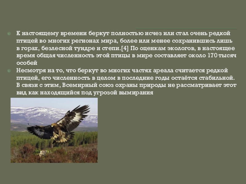 Слайд 4К настоящему времени беркут полностью исчез или стал очень редкой птицей