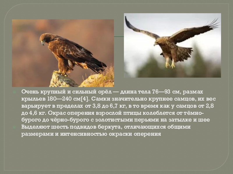 Слайд 3Очень крупный и сильный орёл — длина тела 76—93 см, размах