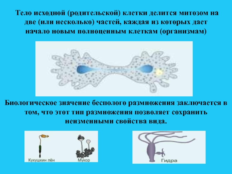 Биологическое значение бесполого размножения заключается в том, что этот тип размножения позволяет сохранить неизменными свойства вида.
