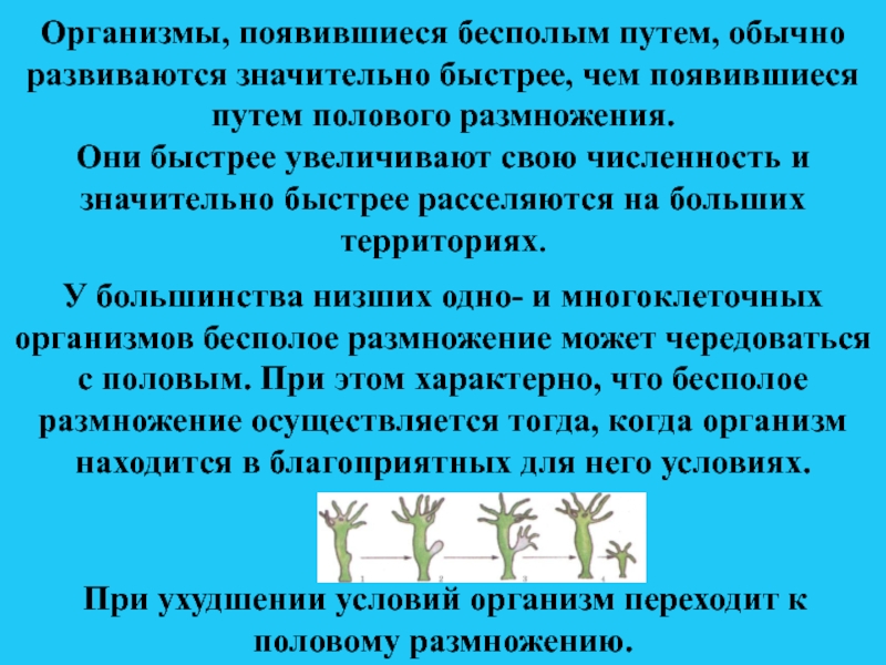 У большинства низших одно- и многоклеточных организмов бесполое размножение может чередоваться с половым. При этом характерно, что бесполое размножение осуществляется тогда, когда организм находится в благоприятных для него условиях.