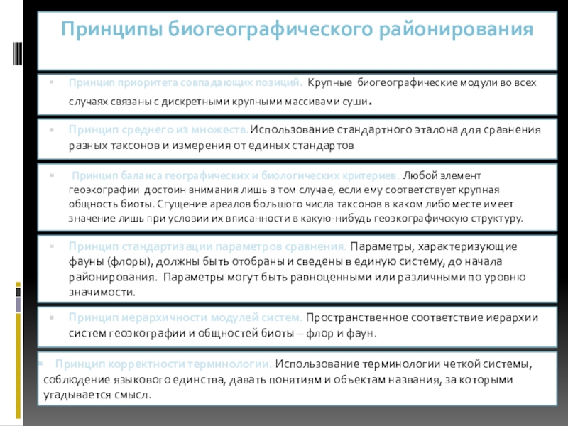 Принцип стандартизации параметров сравнения. Параметры, характеризующие фауны (флоры), должны быть отобраны и сведены в единую систему, до начала районирования. Параметры могут быть равноценными или различными по уровню значимости.