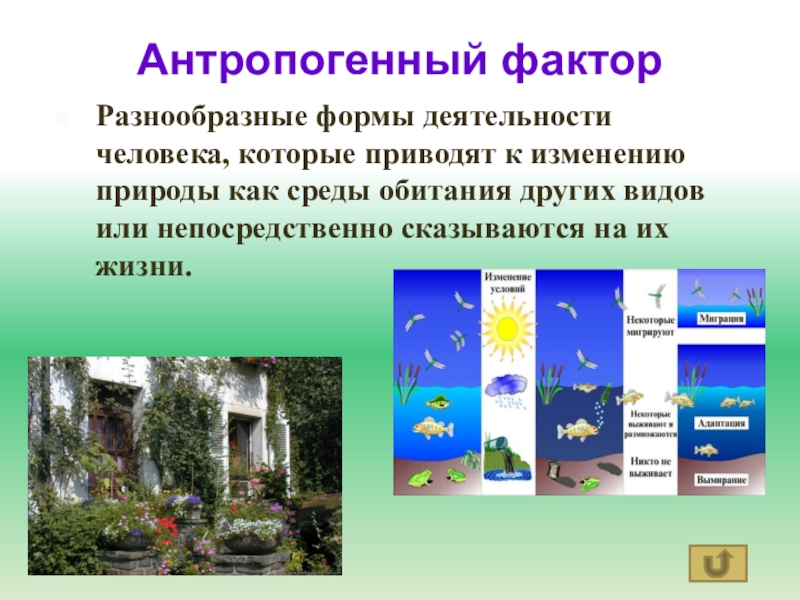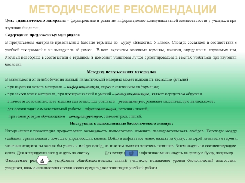Интерактивная презентация предоставляет возможность пользователю изменять последовательность слайдов. Переходы между слайдами организованы с помощью управляющих кнопок. Войдя в алфавитное меню, нажать на букву, с которой начинается термин, значение которого вы хотели бы узнать и выйдет слайд, на котором имеется перечень терминов. Затем нажать на соответствующее слово. Для возвращения назад нажать на кнопку Для возвращения в алфавитное меню нажать на главную букву, например