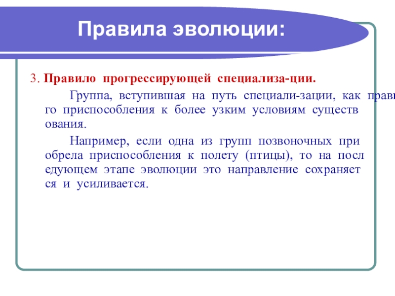 Например, если одна из групп позвоночных приобрела приспособления к полету (птицы), то на последующем этапе эволюции это направление сохраняется и усиливается.