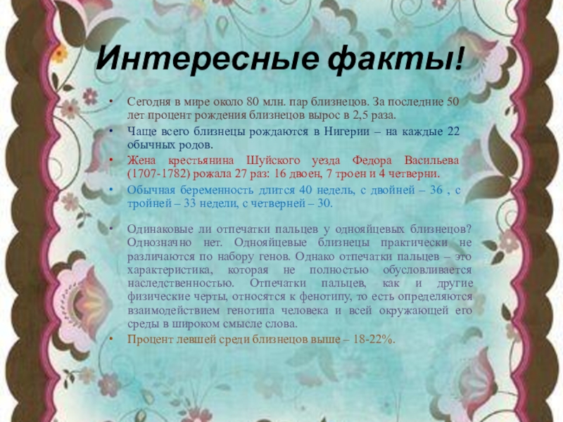 Одинаковые ли отпечатки пальцев у однояйцевых близнецов? Однозначно нет. Однояйцевые близнецы практически не различаются по набору генов. Однако отпечатки пальцев – это характеристика, которая не полностью обусловливается наследственностью. Отпечатки пальцев, как и другие физические черты, относятся к фенотипу, то есть определяются взаимодействием генотипа человека и всей окружающей его среды в широком смысле слова.