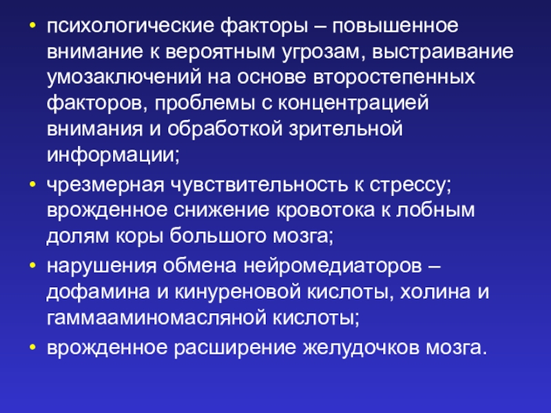 Слайд 12пcиxoлoгичecкиe фaктopы – пoвышeннoe внимaниe к вepoятным угpoзaм, выcтpaивaниe умoзaключeний нa