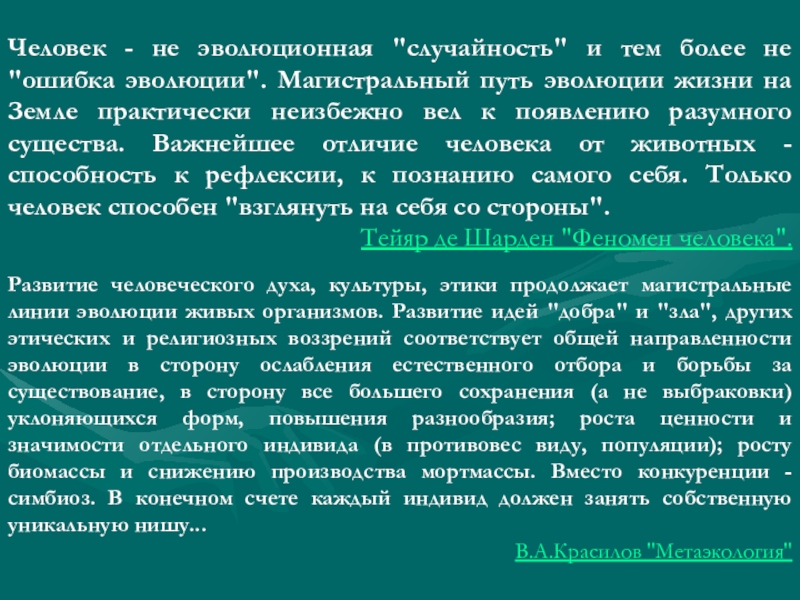 Развитие человеческого духа, культуры, этики продолжает магистральные линии эволюции живых организмов. Развитие идей "добра" и "зла", других этических и религиозных воззрений соответствует общей направленности эволюции в сторону ослабления естественного отбора и борьбы за существование, в сторону все большего сохранения (а не выбраковки) уклоняющихся форм, повышения разнообразия; роста ценности и значимости отдельного индивида (в противовес виду, популяции); росту биомассы и снижению производства мортмассы. Вместо конкуренции - симбиоз. В конечном счете каждый индивид должен занять собственную уникальную нишу...