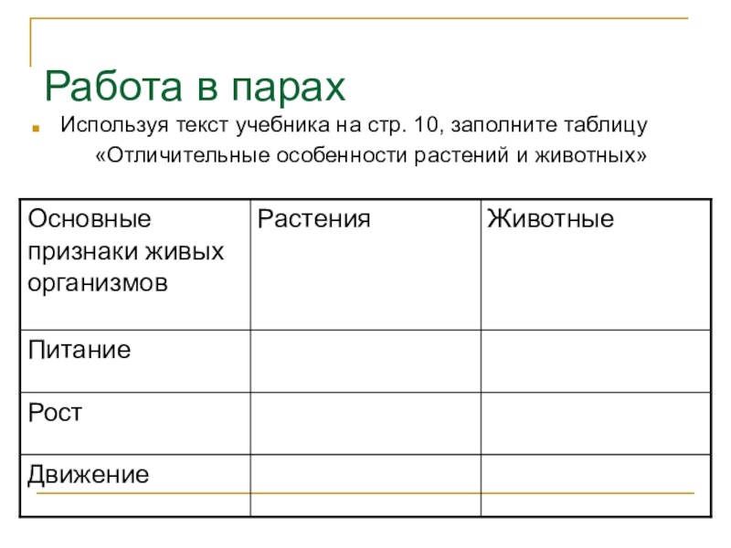 Работа в парахИспользуя текст учебника на стр. 10, заполните таблицу«Отличительные особенности растений и животных»