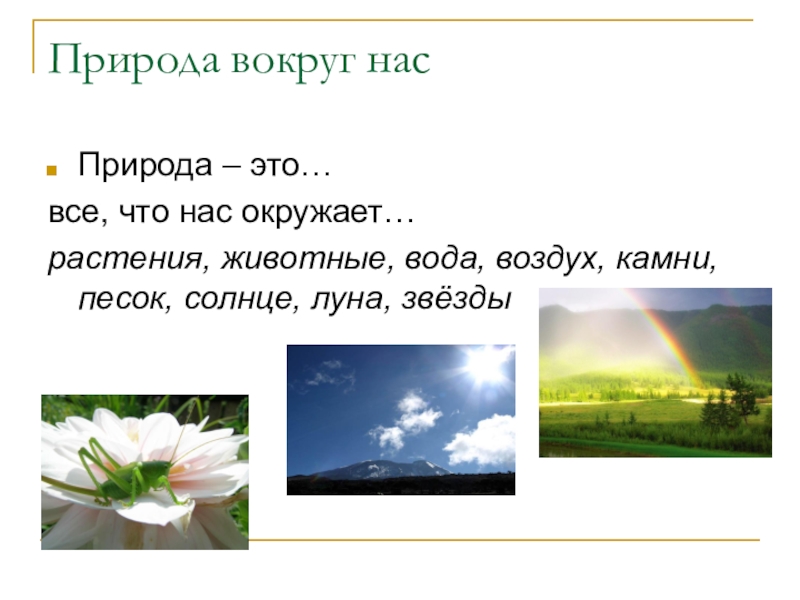 Природа вокруг насПрирода – это…все, что нас окружает…растения, животные, вода, воздух, камни, песок, солнце, луна, звёзды