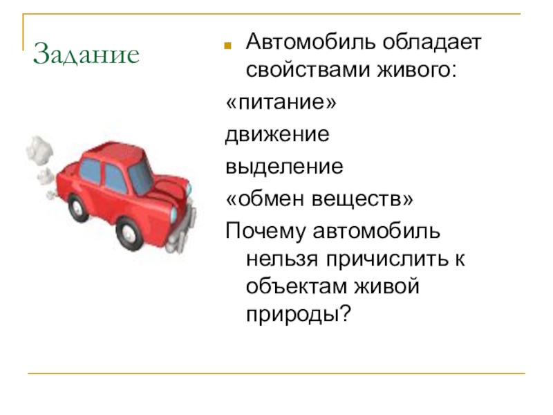 Задание Автомобиль обладает свойствами живого:«питание»движениевыделение «обмен веществ»Почему автомобиль нельзя причислить к объектам живой природы?