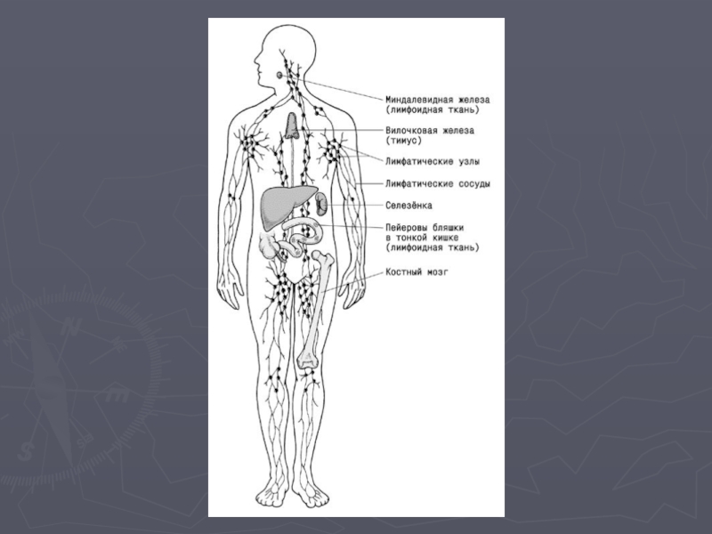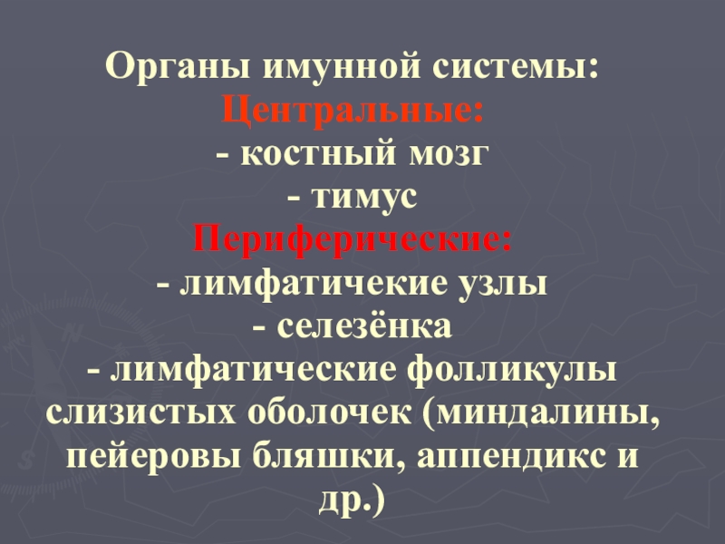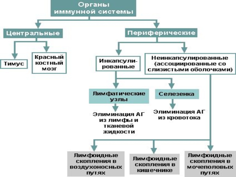 Органы имунной системы: Центральные: - костный мозг - тимус Периферические: - лимфатичекие узлы  - селезёнка