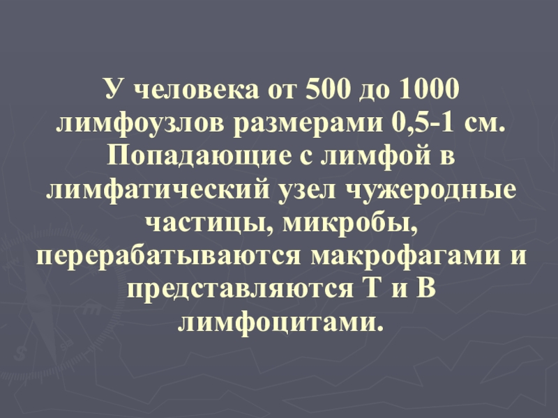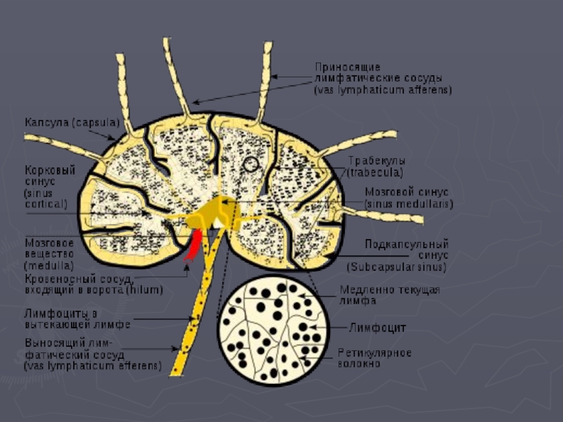 размерами 0,5-1 см. Попадающие с лимфой в лимфатический узел чужеродные частицы, микробы, перерабатываются макрофагами и представляются Т и В лимфоцитами.