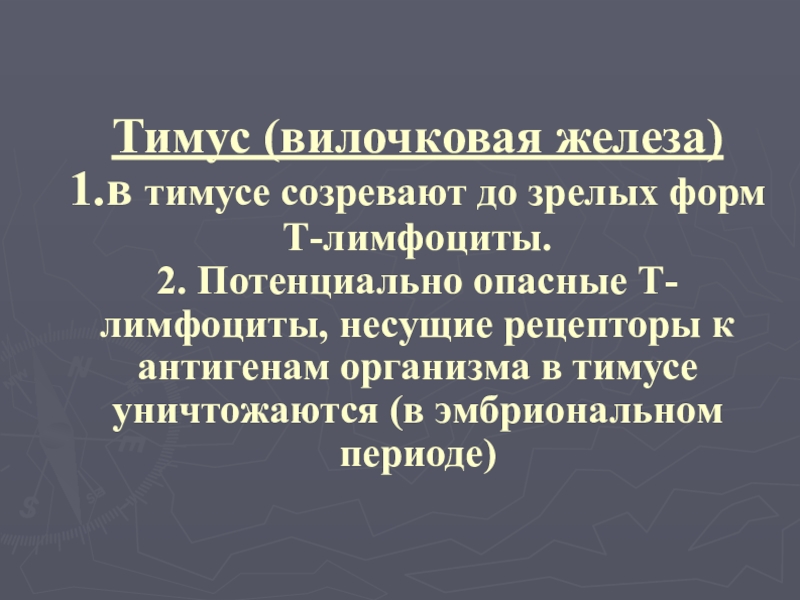 Слайд 6Тимус (вилочковая железа) 1.в тимусе созревают до зрелых форм Т-лимфоциты. 2. Потенциально опасные