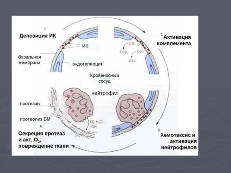 Патогенный эффект возникает в следствии активации комплемента и привлечения полиморфноядерных лейкоцитов, высвобождающих при контакте с комплексами Аг-Ат медиаторы, повреждающие ткани