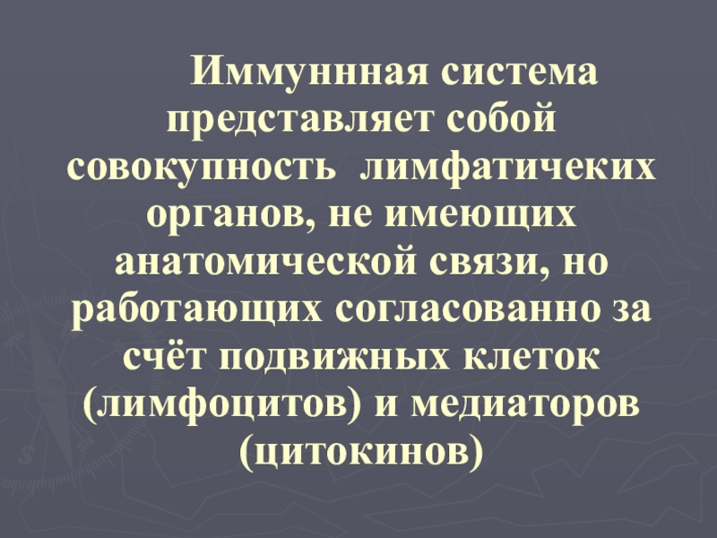 Иммуннная система представляет собой совокупность лимфатичеких органов, не имеющих анатомической связи, но работающих согласованно за счёт подвижных клеток (лимфоцитов) и медиаторов