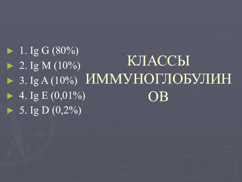 КЛАССЫ ИММУНОГЛОБУЛИНОВ1. Ig G (80%)‏2. Ig M (10%)‏3. Ig A (10%)‏4. Ig E (0,01%)‏5. Ig D (0,2%)‏