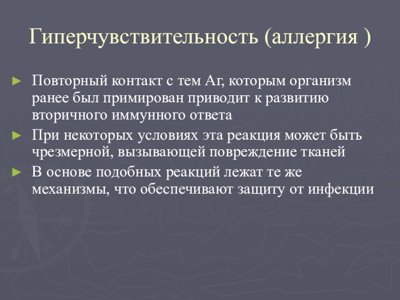 Гиперчувствительность (аллергия )Повторный контакт с тем Аг, которым организм ранее был примирован приводит к развитию вторичного иммунного