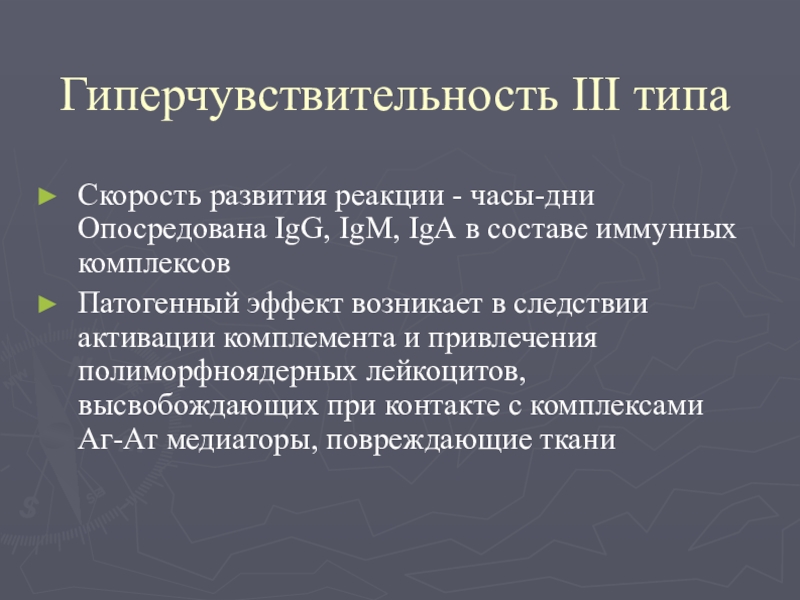 Гиперчувствительность III типаСкорость развития реакции - часы-дни Опосредована IgG, IgM, IgА в составе иммунных комплексовПатогенный эффект возникает