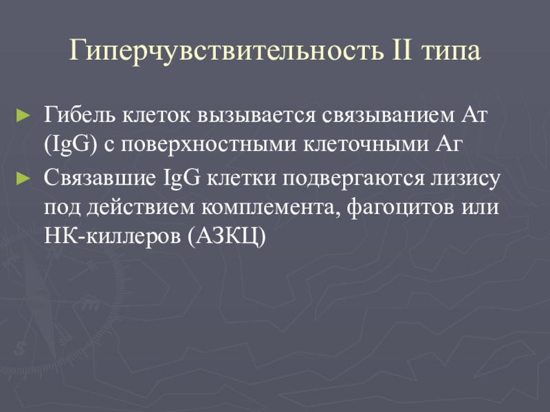 Гиперчувствительность II типаГибель клеток вызывается связыванием Ат (IgG) с поверхностными клеточными АгСвязавшие IgG клетки подвергаются лизису под