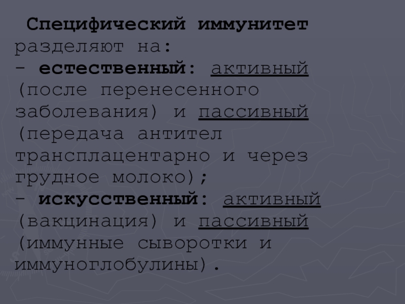 Специфический иммунитет разделяют на: - естественный: активный (после перенесенного заболевания) и пассивный (передача антител трансплацентарно и