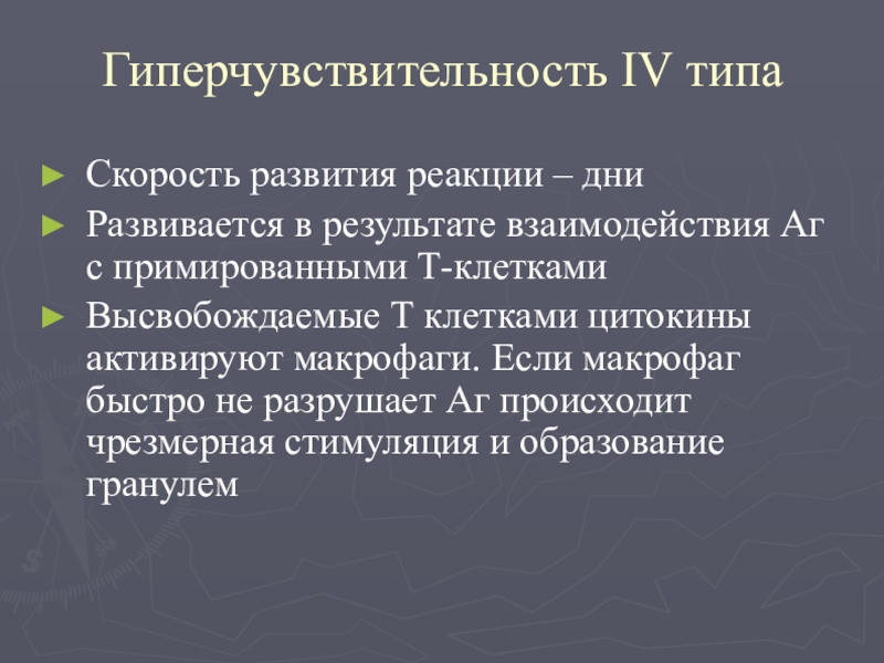 Гиперчувствительность IV типаСкорость развития реакции – дниРазвивается в результате взаимодействия Аг с примированными Т-клеткамиВысвобождаемые Т клетками цитокины