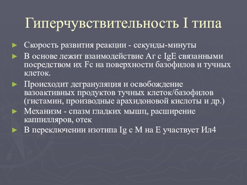 Гиперчувствительность I типаСкорость развития реакции - секунды-минутыВ основе лежит взаимодействие Аг с IgЕ связанными посредством их Fc