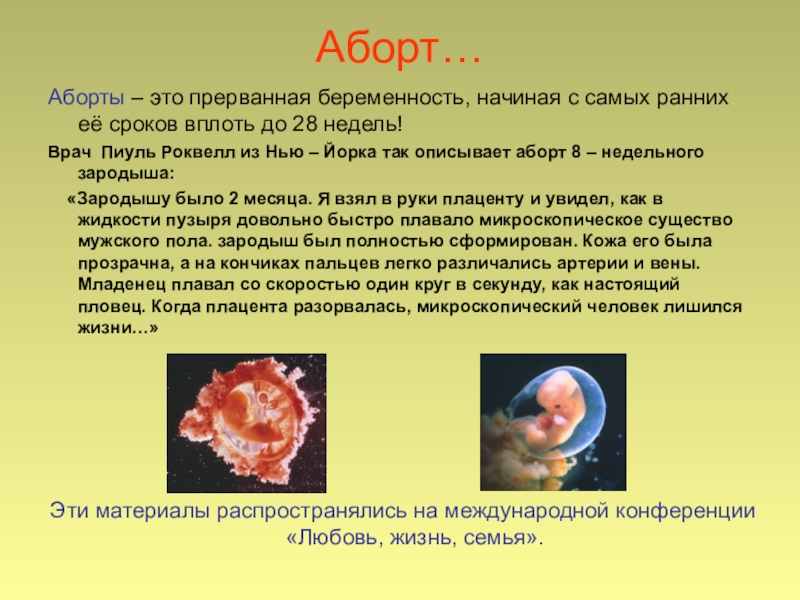 Врач Пиуль Роквелл из Нью – Йорка так описывает аборт 8 – недельного зародыша: