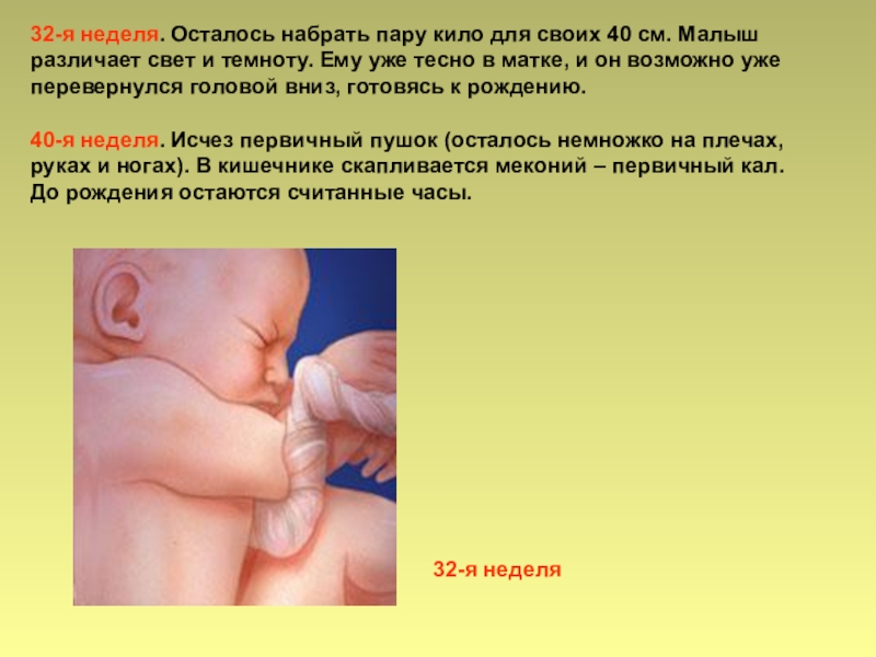 40-я неделя. Исчез первичный пушок (осталось немножко на плечах, руках и ногах). В кишечнике скапливается меконий – первичный кал.