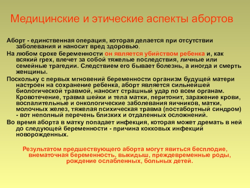 На любом сроке беременности он является убийством ребенка и, как всякий грех, влечет за собой тяжелые последствия, личные или семейные трагедии. Следствием его бывает болезнь, а иногда и смерть женщины.