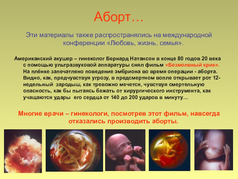 – гинеколог Бернард Натансон в конце 80 годов 20 века с помощью ультразвуковой аппаратуры снял фильм «Безмолвный крик». На плёнке запечатлено поведение эмбриона во время операции - аборта. Видно, как, предчувствуя угрозу, в предсмертном вопле открывает рот 12- недельный зародыш, как тревожно мечется, чувствуя смертельную опасность, как бы пытаясь бежать от хирургического инструмента, как учащаются удары его сердца от 140 до 200 ударов в минуту…