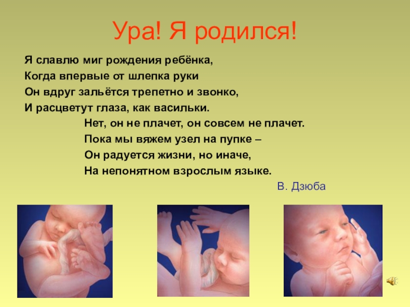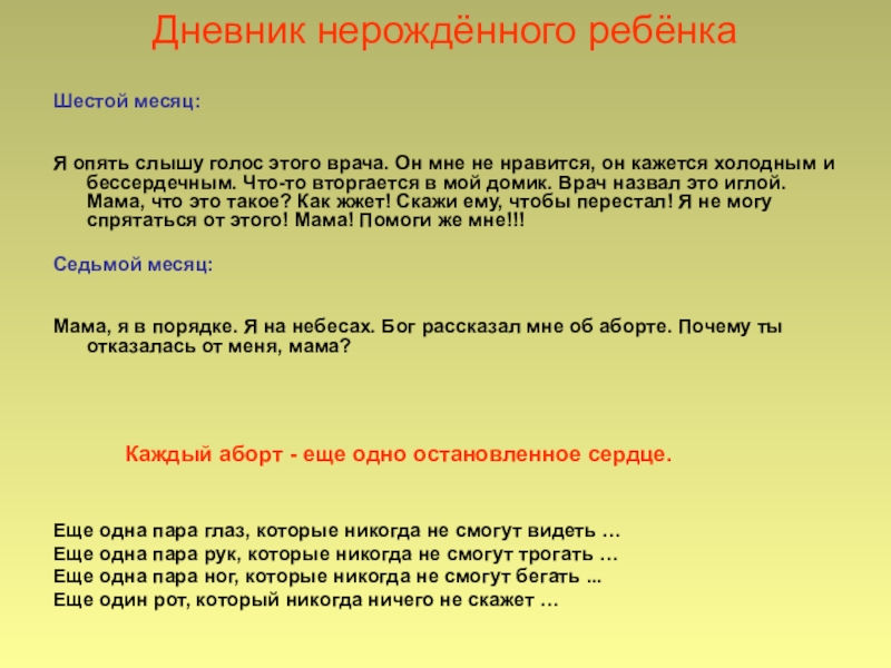 Мама, я всего еще двадцать сантиметров ростом, но у меня все органы на месте. Я люблю твой голос. Каждый раз, когда слышу его, машу ножками и ручками. Биение твоего сердца - моя любимая колыбельная.
