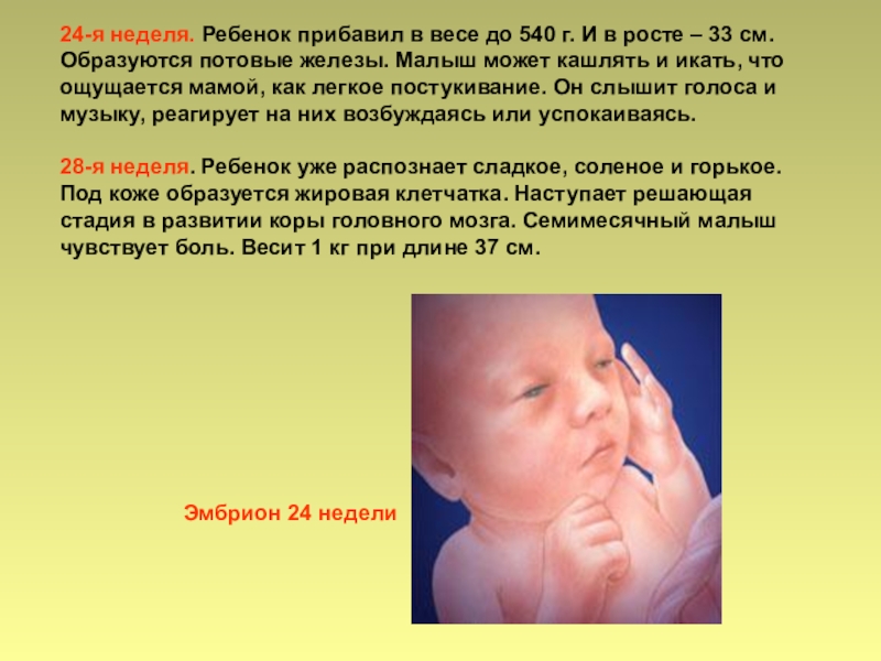 28-я неделя. Ребенок уже распознает сладкое, соленое и горькое. Под коже образуется жировая клетчатка. Наступает решающая стадия в развитии коры головного мозга. Семимесячный малыш чувствует боль. Весит 1 кг при длине 37 см.