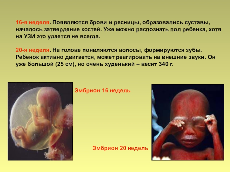 20-я неделя. На голове появляются волосы, формируются зубы. Ребенок активно двигается, может реагировать на внешние звуки. Он уже большой (25 см), но очень худенький – весит 340 г.