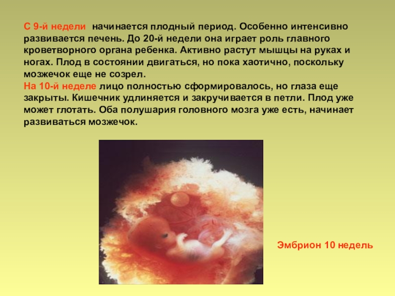 Слайд 5С 9-й недели начинается плодный период. Особенно интенсивно развивается печень. До