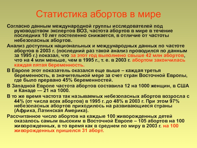 Анализ доступных национальных и международных данных по частоте абортов в 2003 г. (последний раз такой анализ проводился по данным за 1995 г.) показал, что за этот год выполнено свыше 42 млн абортов, что на 4 млн меньше, чем в 1995 г., т. е. в 2003 г. абортом закончилась каждая пятая беременность.