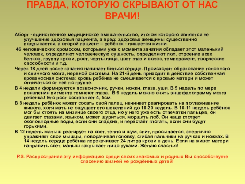 P.S. Распространяя эту информацию среди своих знакомых и родных Вы способствуете спасению жизней не рождённых детей!