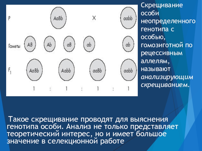 Такое скрещивание проводят для выяснения генотипа особи. Анализ не только представляет теоретический интерес, но и имеет большое значение в селекционной работе