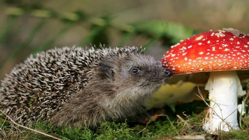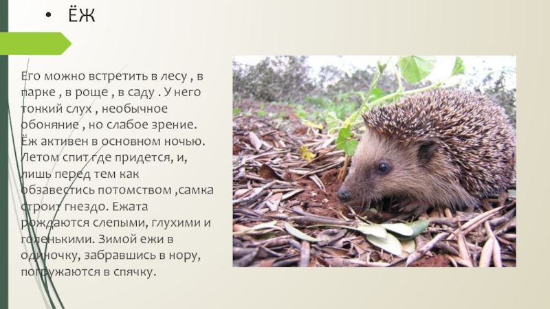 , в саду . У него тонкий слух , необычное обоняние , но слабое зрение. Ёж активен в основном ночью. Летом спит где придется, и, лишь перед тем как обзавестись потомством ,самка строит гнездо. Ежата рождаются слепыми, глухими и голенькими. Зимой ежи в одиночку, забравшись в нору, погружаются в спячку.