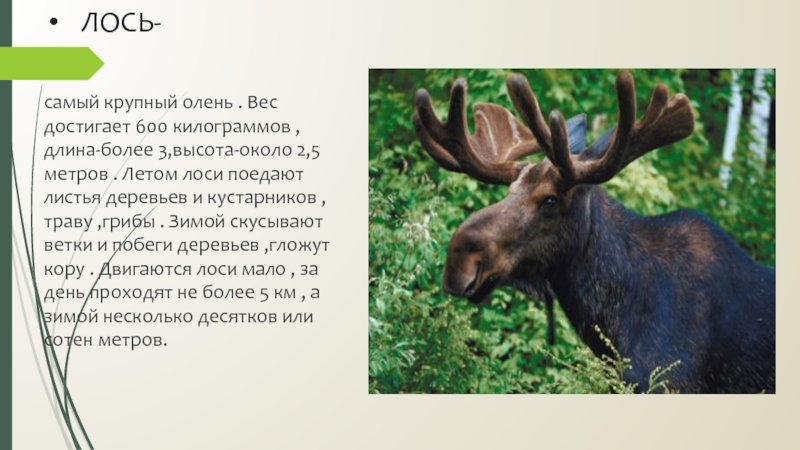2,5 метров . Летом лоси поедают листья деревьев и кустарников , траву ,грибы . Зимой скусывают ветки и побеги деревьев ,гложут кору . Двигаются лоси мало , за день проходят не более 5 км , а зимой несколько десятков или сотен метров.