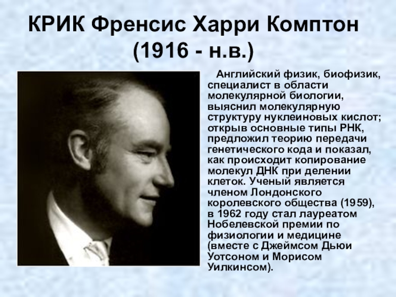Слайд 4КРИК Френсис Харри Комптон (1916 - н.в.)