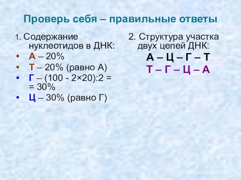 1. Содержание адениновых нуклеотидов А в молекуле ДНК равно 20%. Определите содержание остальных (каких?) нуклеотидов.