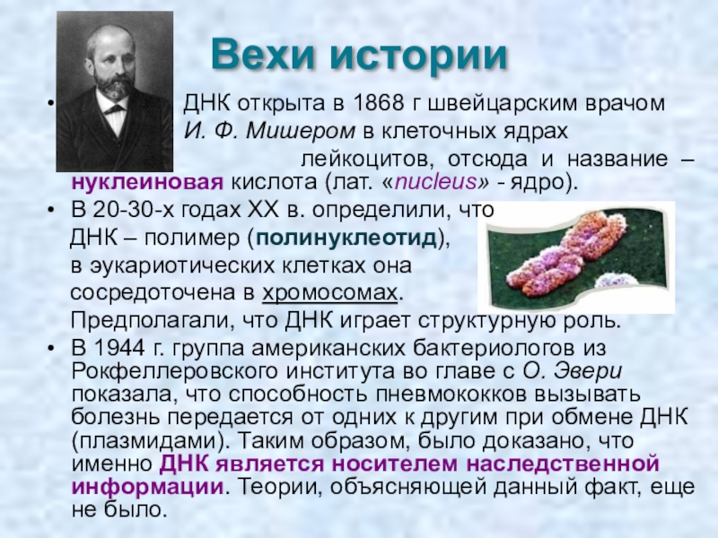 В 1944 г. группа американских бактериологов из Рокфеллеровского института во главе с О. Эвери показала, что способность пневмококков вызывать болезнь передается от одних к другим при обмене ДНК (плазмидами). Таким образом, было доказано, что именно ДНК является носителем наследственной информации. Теории, объясняющей данный факт, еще не было.