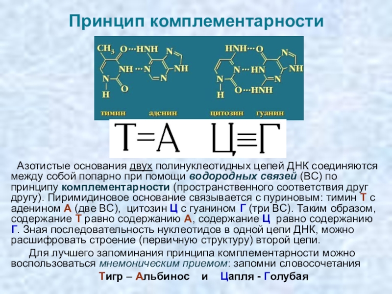 соединяются между собой попарно при помощи водородных связей (ВС) по принципу комплементарности (пространственного соответствия друг другу). Пиримидиновое основание связывается с пуриновым: тимин Т с аденином А (две ВС), цитозин Ц с гуанином Г (три ВС). Таким образом, содержание Т равно содержанию А, содержание Ц равно содержанию Г. Зная последовательность нуклеотидов в одной цепи ДНК, можно расшифровать строение (первичную структуру) второй цепи.