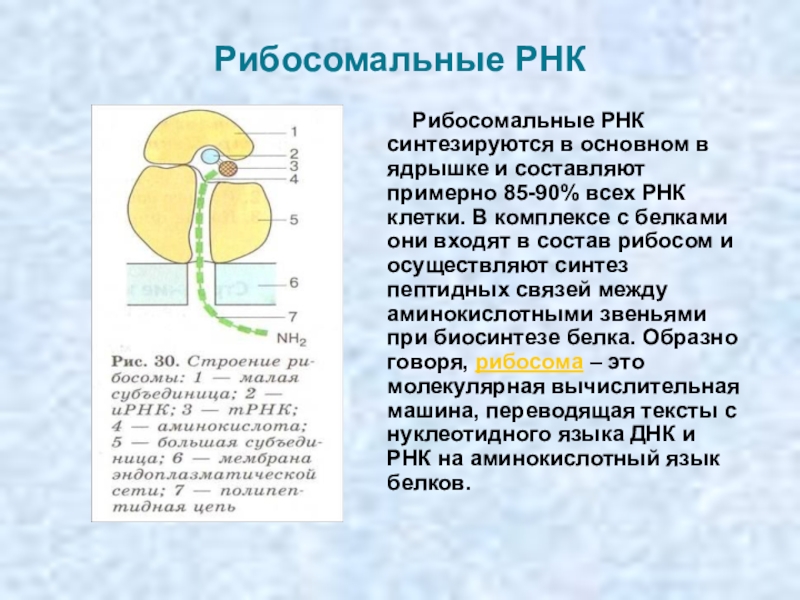 в ядрышке и составляют примерно 85-90% всех РНК клетки. В комплексе с белками они входят в состав рибосом и осуществляют синтез пептидных связей между аминокислотными звеньями при биосинтезе белка. Образно говоря, рибосома – это молекулярная вычислительная машина, переводящая тексты с нуклеотидного языка ДНК и РНК на аминокислотный язык белков.