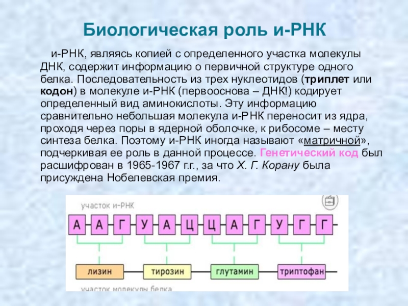 участка молекулы ДНК, содержит информацию о первичной структуре одного белка. Последовательность из трех нуклеотидов (триплет или кодон) в молекуле и-РНК (первооснова – ДНК!) кодирует определенный вид аминокислоты. Эту информацию сравнительно небольшая молекула и-РНК переносит из ядра, проходя через поры в ядерной оболочке, к рибосоме – месту синтеза белка. Поэтому и-РНК иногда называют «матричной», подчеркивая ее роль в данной процессе. Генетический код был расшифрован в 1965-1967 г.г., за что Х. Г. Корану была присуждена Нобелевская премия.