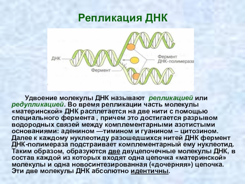 репликацией или редупликацией. Во время репликации часть молекулы «материнской» ДНК расплетается на две нити с помощью специального фермента , причем это достигается разрывом водородных связей между комплементарными азотистыми основаниями: аденином —тимином и гуанином – цитозином. Далее к каждому нуклеотиду разошедшихся нитей ДНК фермент ДНК-полимераза подстраивает комплементарный ему нуклеотид. Таким образом, образуются две двуцепочечные молекулы ДНК, в состав каждой из которых входят одна цепочка «материнской» молекулы и одна новосинтезированная («дочерняя») цепочка. Эти две молекулы ДНК абсолютно идентичны.
