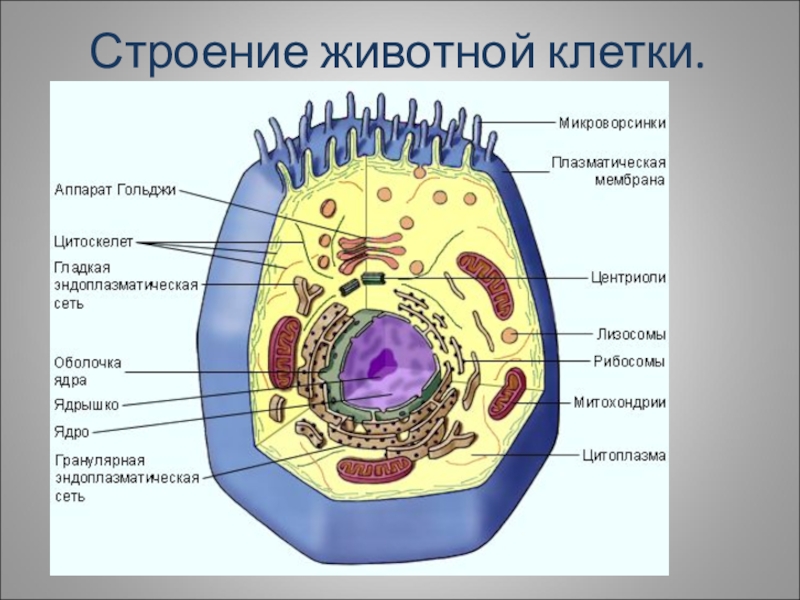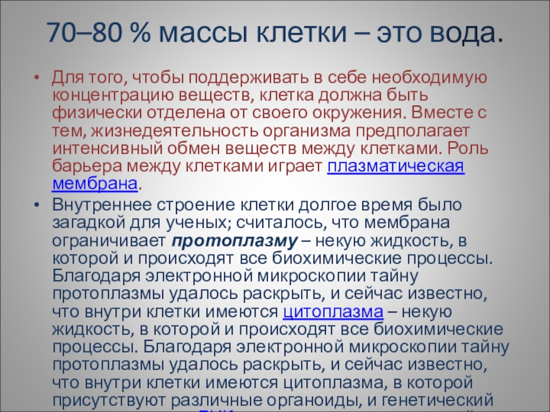 Внутреннее строение клетки долгое время было загадкой для ученых; считалось, что мембрана ограничивает протоплазму – некую жидкость, в которой и происходят все биохимические процессы. Благодаря электронной микроскопии тайну протоплазмы удалось раскрыть, и сейчас известно, что внутри клетки имеются цитоплазма – некую жидкость, в которой и происходят все биохимические процессы. Благодаря электронной микроскопии тайну протоплазмы удалось раскрыть, и сейчас известно, что внутри клетки имеются цитоплазма, в которой присутствуют различные органоиды, и генетический материал в виде ДНК – некую жидкость, в которой и происходят все биохимические процессы. Благодаря электронной микроскопии тайну протоплазмы удалось раскрыть, и сейчас известно, что внутри клетки имеются цитоплазма, в которой присутствуют различные органоиды, и генетический материал в виде ДНК, собранный, в основном, в ядре (у эукариот).