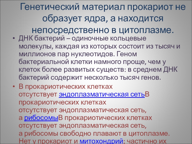 Слайд 8Генетический материал прокариот не образует ядра, а находится непосредственно в цитоплазме.